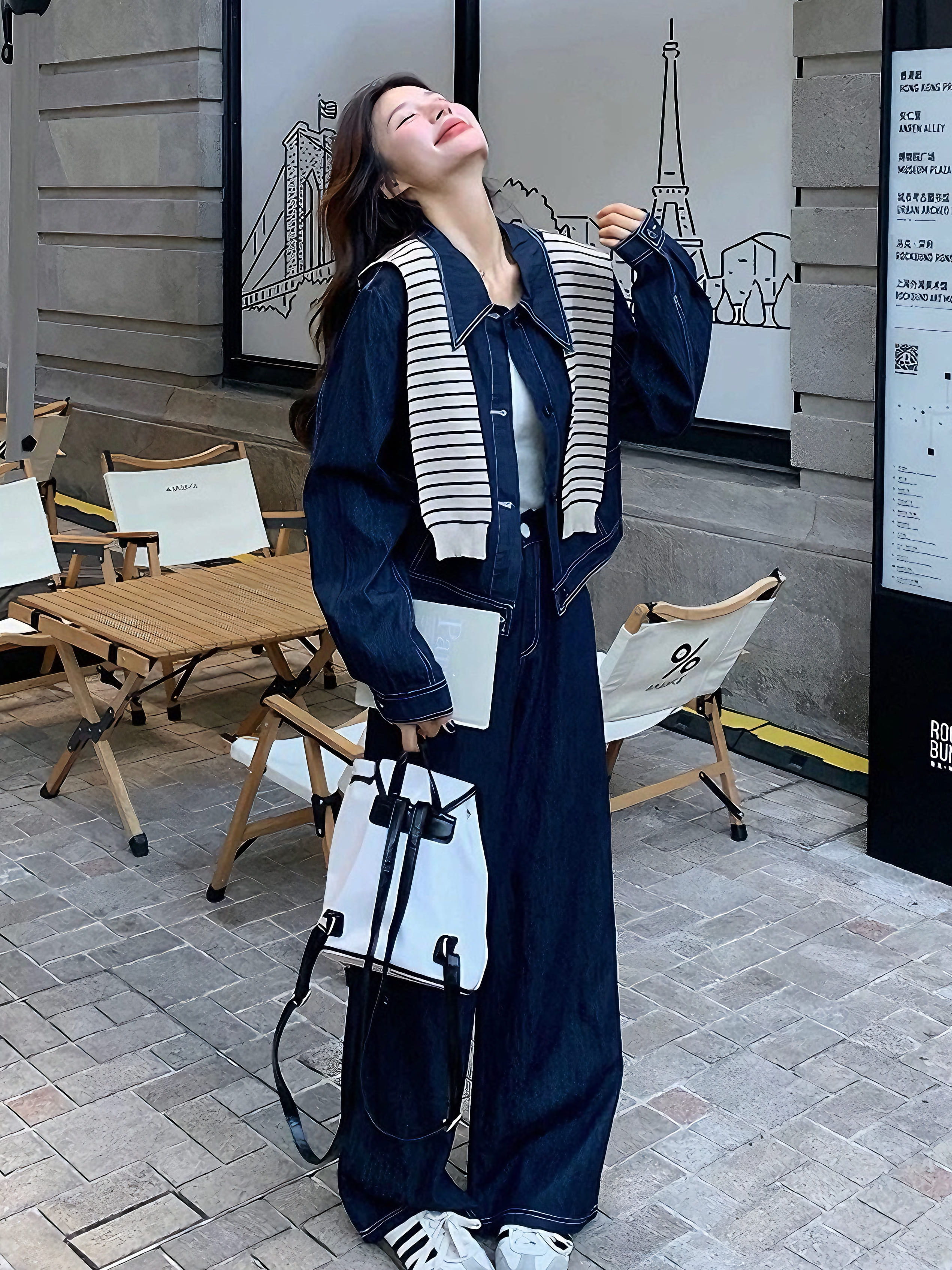 新款時髦洋氣拼接牛仔加棉兩件套套裝