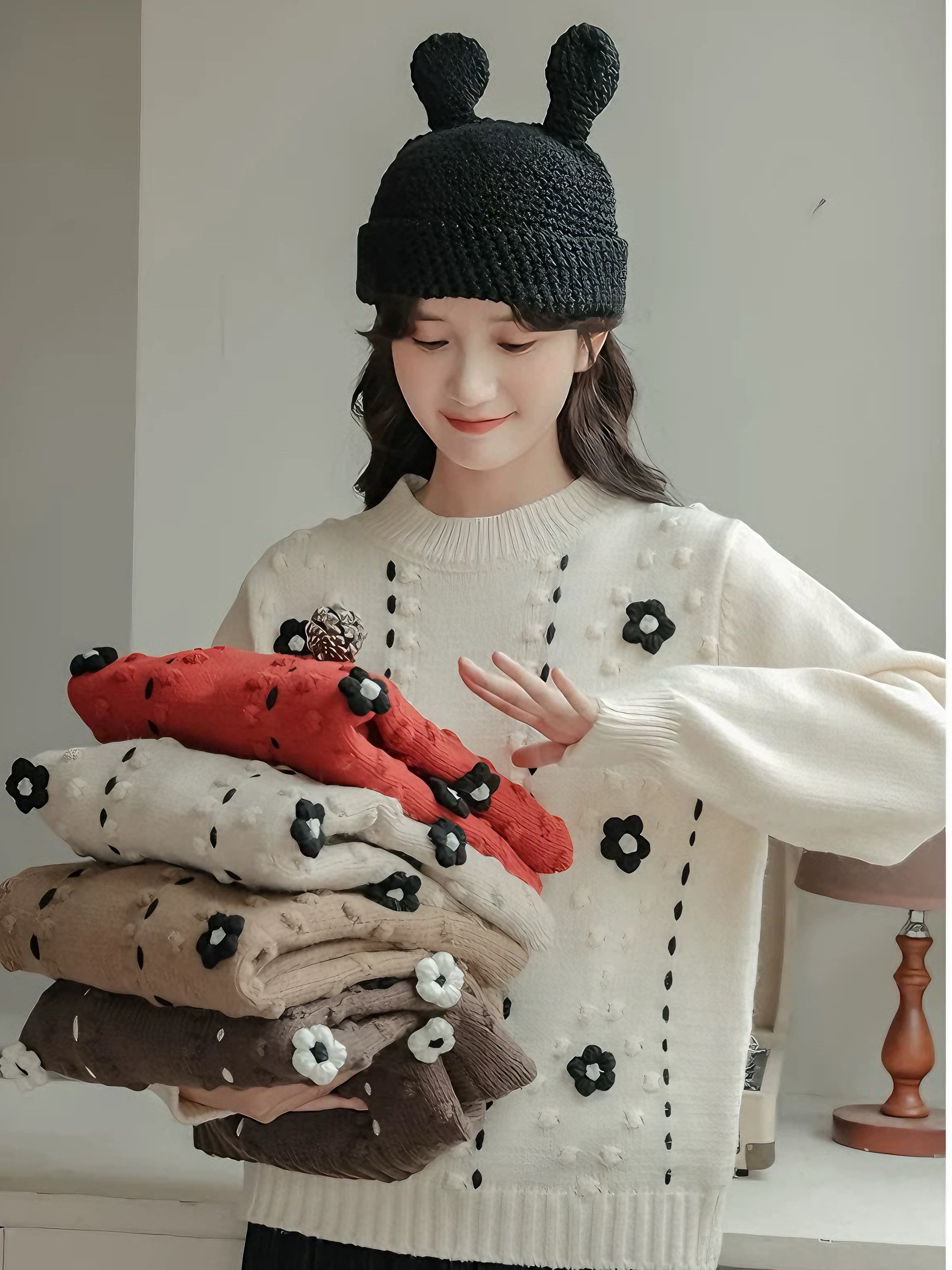 秋冬新款日系花朵加厚慵懶寬鬆毛衣