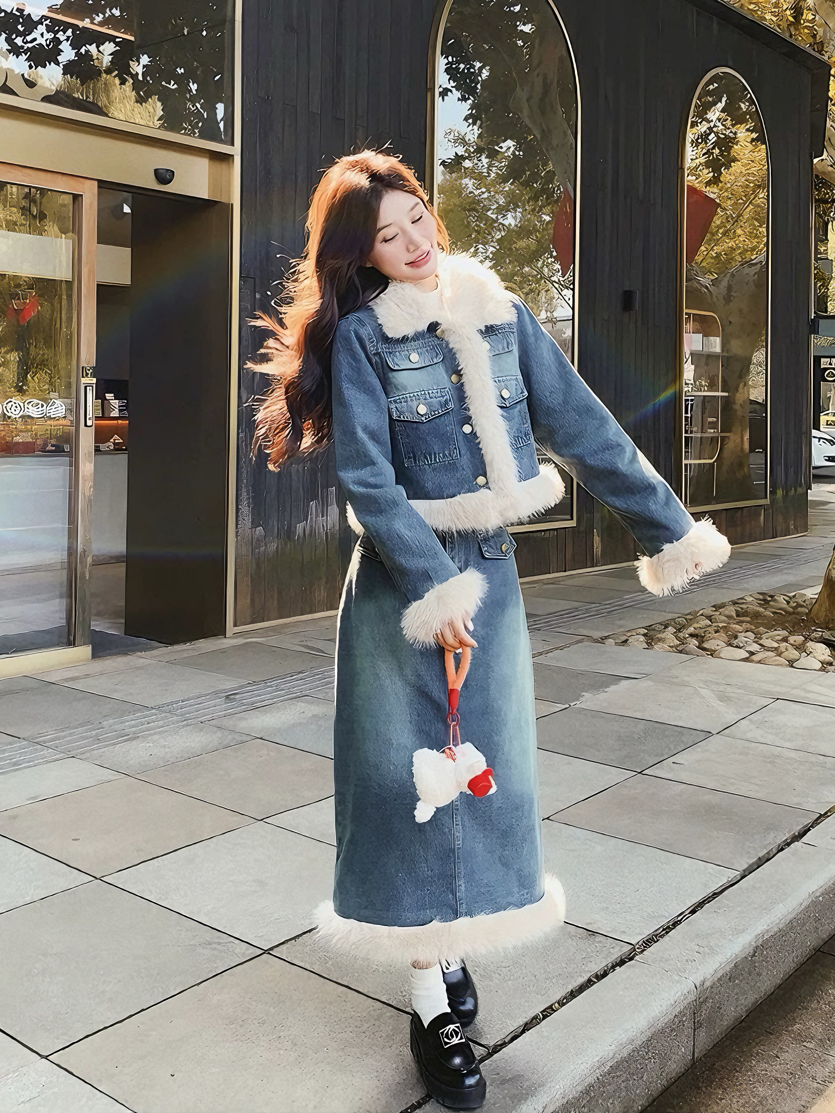 新款時髦洋氣拼接牛仔加棉兩件套套裝