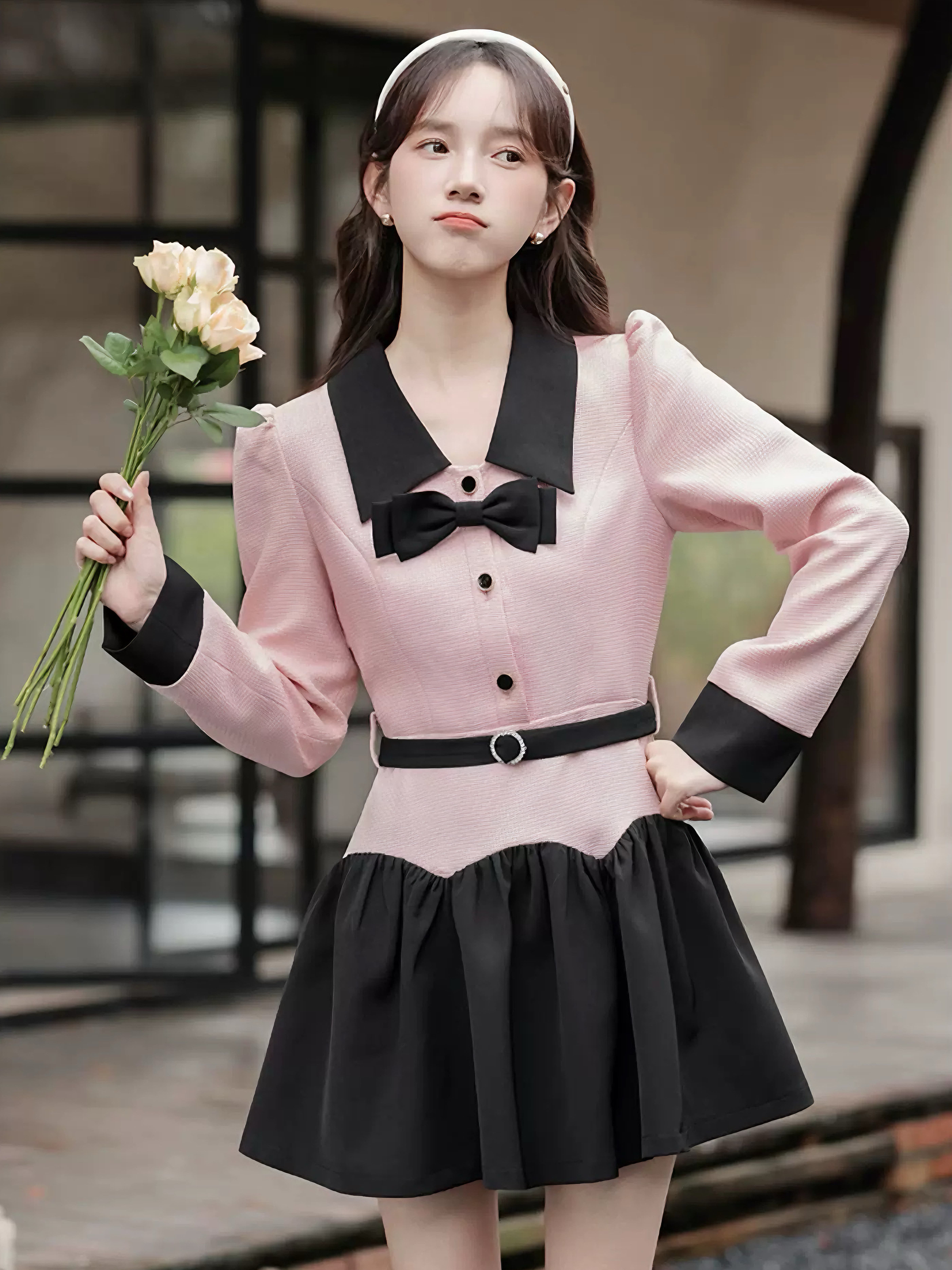 精緻甜美氣質感輕奢長袖粉色連衣裙
