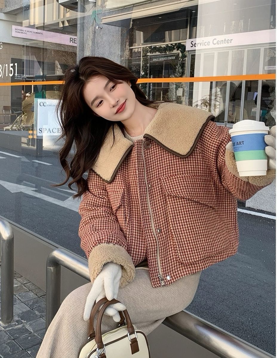 翻領紅格紋寬鬆短版白鴨絨羽絨 ...