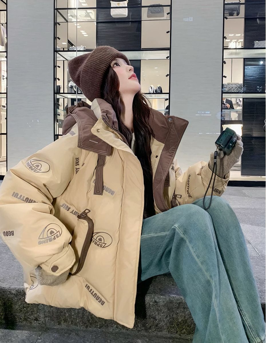 減齡印花卡奇色保暖加厚羽絨外 ...