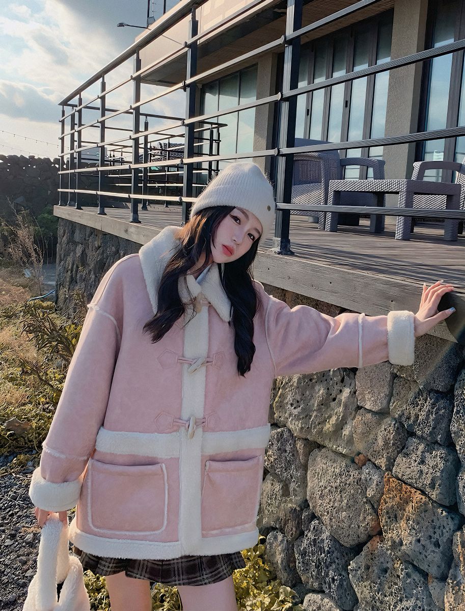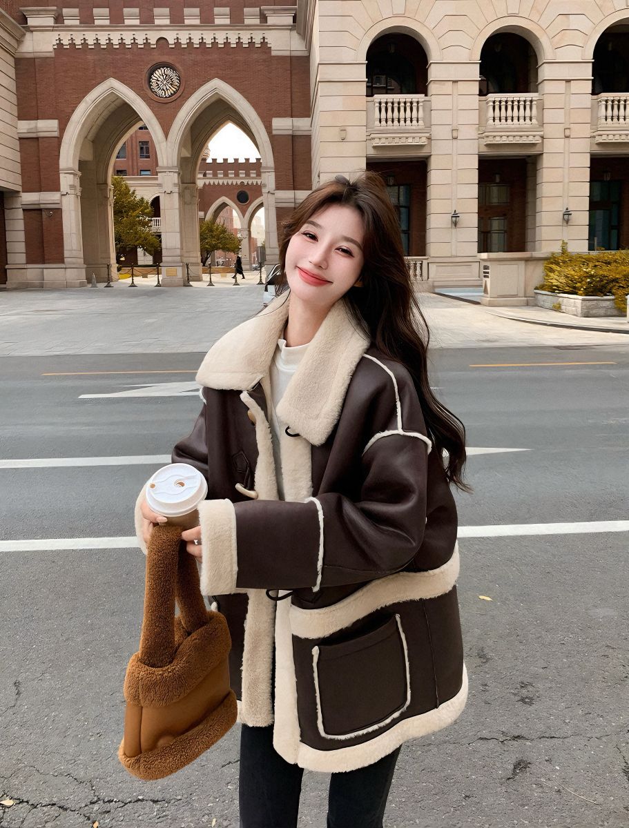 冬季咖色復古美拉得皮角扣羊羔 ...